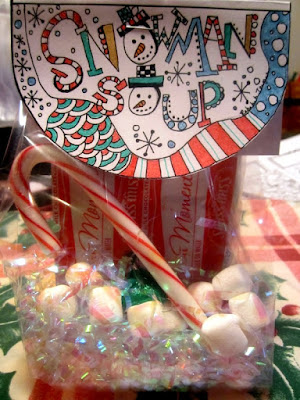 I first heard of Snowman Soup many years ago. My sister-in-law and her family participated in a secret "pal" kind of gift exchange that took place with other members of their church. One cold evening, they heard a knock at the door. When they opened the door the family found a whole basket filled with Snowman Soup ingredients and a cute little poem. A bag of marshmallows! A box of candy canes, fun Christmas mugs....Everything a family would need for a wintery night at home.